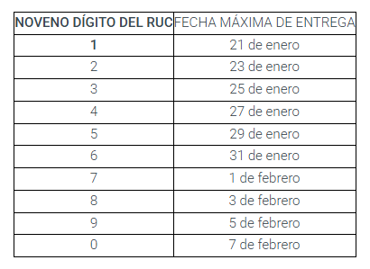 Los empleadores deberán presentar la información relativa a las retenciones en la fuente del Impuesto a la Renta de ingresos del trabajo bajo relación de dependencia, realizadas en el período comprendido entre el 1 de enero y 31 de diciembre del año 2025, conforme al noveno dígito del RUC desde el 21 de enero hasta el 7 de febrero.